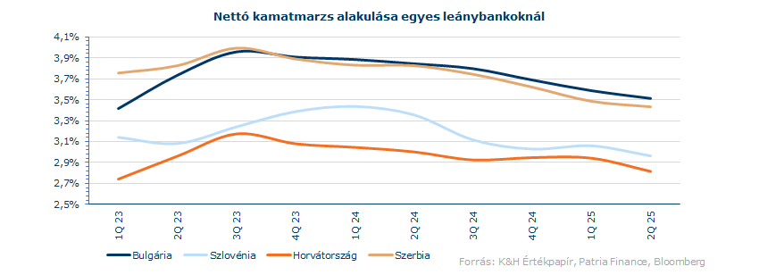 A leánybankokra áttérve Bulgáriában a DSK Group az első félévben 10 százalék feletti hitelvolumenbővülést tapasztalt. A nettó kamatmarzs tekintetében viszont látható a romlás, az EKB kamatcsökkentéseit követően 3,7 százalékról 3,5 százalékra esett vissza a DSK Group nettó kamatmarzsa. Betéti oldalon is 10 százalék körüli volumennövekedés volt látható a DSK Groupnál az első félévben, de várhatóan a második félévben további betétbeáramlás várható a lakosság részéről, akik az euró bevezetésére készülnek.