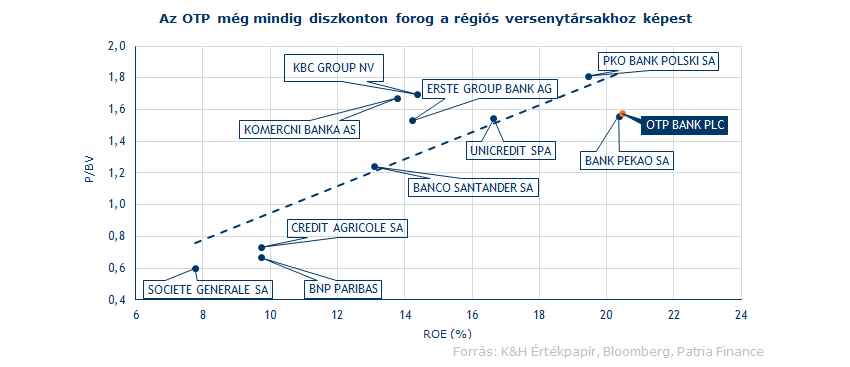 Az OTP esetében kijelenthető, hogy még mindig diszkont mutatkozik az európai banki átlagokhoz képest. A régiós versenytársakkal összehasonlítva a lengyel bankok továbbra is némi prémiumot mutatnak az OTP-vel szemben, de az osztrák bankok értékeltségi mutatói is jobban elszálltak, mint az OTP esetében.