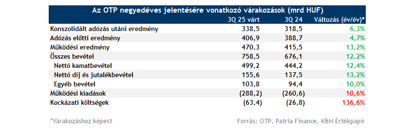 Az OTP nettó kamatmarzsa tovább javulhat a harmadik negyedévben, amit a stabil euróövezeti kamatlábak és a kedvező magyar hozamkörnyezet is támogathat. A lakossági hitelezés volumene továbbra is erős, különösen Magyarországon, Bulgáriában és Szerbiában. Így a konszolidált nettó kamatbevétel éves szinten akár 12 százalékkal nőhet, megközelítve az 500 milliárd forintot. A működési költségek szintén növekedhetnek, de a kockázati költségek terén nem várható jelentős változás az előző negyedévhez képest. A bankcsoport nettó eredménye várhatóan 338,5 milliárd forint körül alakul, ami éves szinten 6 százalékos növekedést jelentene. Az OTP november 7-én, piacnyitás előtt teszi közzé harmadik negyedéves jelentését.
