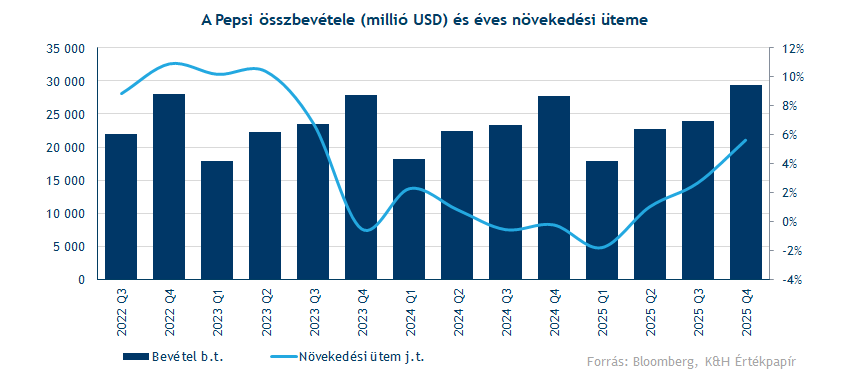 Teljesítette az előzetes bevételvárakozásokat a PepsiCo a negyedik negyedévben, így összesen 29,34 milliárd dolláros bevételt generált a társaság. Ez éves szinten 5,6 százalékos bevételnövekedést jelent, ezzel együtt immár zsinórban a harmadik negyedévben mutat gyorsuló ütemet a PepsiCo bevételnövekedése. A 2025-ös évet tehát erősen zárta az üdítőitalgyártó, az egész éves bevétel 93,9 milliárd dollárra rúgott, ami 2 százalékos javulást jelent a 2024-es szinthez képest.