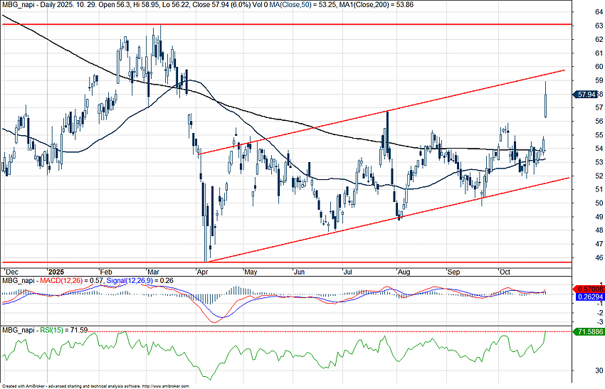 Kedvezően fogadták a befektetők a Mercedes mai jelentését, így nagyot emelkedett az árfolyam a mai kereskedésben, megközelítve ezzel a márciusi szinteket. A Mercedes napi árfolyamképén jól kirajzolódik az az emelkedő trendcsatorna, amelyben az áprilisi mélypontok óta tartózkodik az árfolyam.
