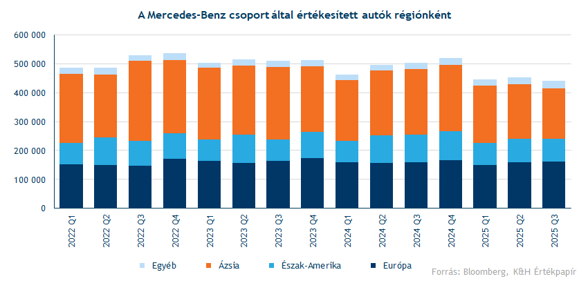 2025 harmadik negyedévében összesen 525 ezer járművet értékesített világszerte a Mercedes-csoport, ami éves szinten 12 százalékos visszaesést jelent. Hasonló trendek voltak láthatóak mint a korábbi negyedévekben, míg Európában a járműértékesítés kisebb mértékben nőtt, addig az amerikai piacon 17 százalékkal csökkent a volumen a vámok hatására. Kínában 27 százalékkal esett vissza az eladott darabszám az elmúlt negyedévben, amire 2016 óta nem volt példa. A Mercedesnek nem segített a prémium járművek iránti kereslet csökkenése, illetve a helyi kínai versenytársak (BYD, Xiaomi) folyamatos piaci térnyerése sem.