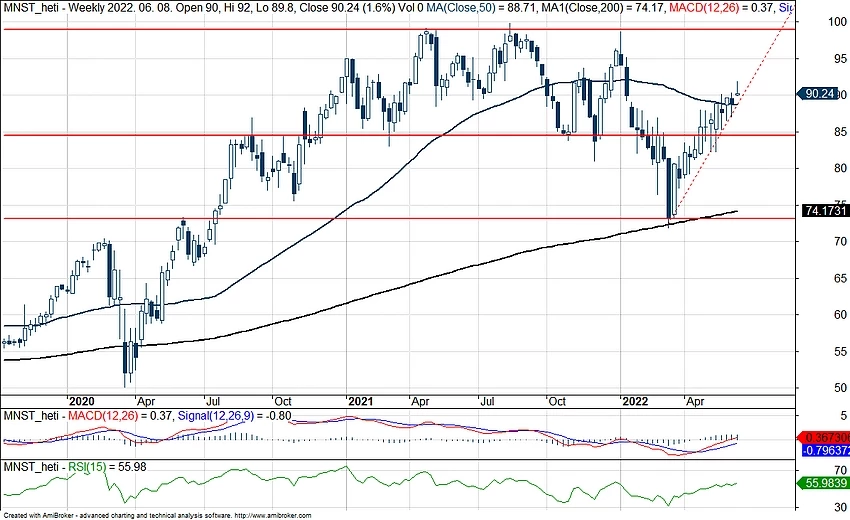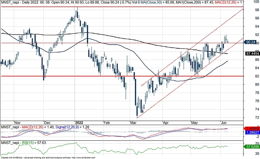 A Monster heti grafikonján látható, hogy az árfolyam az év elején a 100 dollár körüli történelmi csúcsot is tesztelte, onnan azonban éles lefordulás kezdődött. Március elejére már egészen a 200 hetes mozgóátlagig süllyedt le az árfolyam, a pozitív fordulat pedig onnan indult el. Azóta egy emelkedő trendvonal is kialakult a grafikonon, átszakításra került a 85 dolláros ellenállás, és ezen a héten már az 50 hetes mozgóátlag is egyértelműen áttörésre került. Innen már szabad terület nyílhat az árfolyam előtt a 100 dollár közeli csúcszóna elérésére, amely még 10 százalékos felértékelődést jelentene. Korrekció esetén a frissen áttört 50 hetes mozgóátlag, az emelkedő trendvonal és lejjebb a 85 dolláros szint is támaszt képezhet.