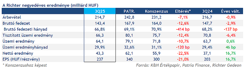 A várakozásoknál gyengébb negyedéves számokat tett közzé a Richter ma piacnyitás előtt, a harmadik negyedéves adatok pedig 2024 hasonló időszakához képest sem hoztak minden soron növekedést. A devizahatások sem segítettek a cégnek, ugyanakkor a GM szegmensben is gyengébb szereplés azonosítható. A menedzsment kismértékben lefelé módosította korábbi éves előrejelzését, így a gyorsjelentés alapvetően negatívan értékelhető. A fundamentumok ugyanakkor azért így is erősödést mutatnak az első 9 hónapban, valamint a bevételek kapcsán látható lassulás is átmeneti lehet.