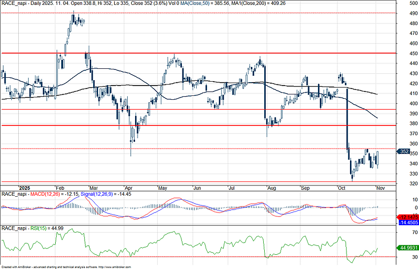 A Ferrari harmadik negyedéves jelentésében magabiztos pénzügyi teljesítményről számolt be, amit kedvezően fogadtak a befektetők. A vállalat áremelésekkel meg tudta őrizni a profitabilitását, és továbbra is erős kereslettel szembesül a prémium járművei iránt, így kedvezőbb helyzetben van versenytársaihoz képest. A vezetőség októberi óvatos előrejelzése után jelentős árfolyamesés következett, így az árfolyam technikailag alacsonyabb szintekről indult újra emelkedésnek.