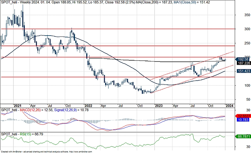 A heti grafikonon még jobban látszódik, hogy a 200 dolláros árszint áttörésével mekkora tér nyílna a részvény előtt. A következő markáns ellenállási szint már a 240 dolláros szint környékén mutatkozik, ami közel 25 százalékos távolságra helyezkedik el a jelenlegi szintekhez képest. 2023-ban jellemzően egy emelkedő trendcsatorna mentén mozgott a Spotify papírja, ami így hosszabb távon is segítheti a kimagasló teljesítményt. Fontos még kiemelni, hogy a 200 hetes mozgóátlagát is sikerült átlépnie az árfolyamnak tavaly, a hetekben pedig épp a mozgóátlagról indult meg felfelé a részvény.
