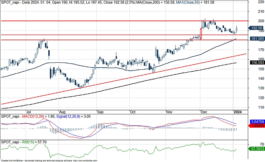 Igaz, a decemberi hónap nem volt kifejezetten erős, leginkább negatív mozgások jellemezték a Spotify papírját. Az idei erős kezdésnek hála viszont még azelőtt visszafordult az árfolyam, hogy a korábbi szinteket újból érintette volna. Egyelőre úgy tűnik, hogy a 185-186 dolláros zóna megfelelő védelemmel szolgált, ami így az elsőszámú támaszszint lehet a napi grafikonon. Ezen felül is be lehet azért húzni további védelmi szinteket, többek közt az 50 napos mozgóátlag is erős támasznak minősült a korábbiakban, de még az emelkedő trendvonal is támogató lehet az előttünk álló időszakban.