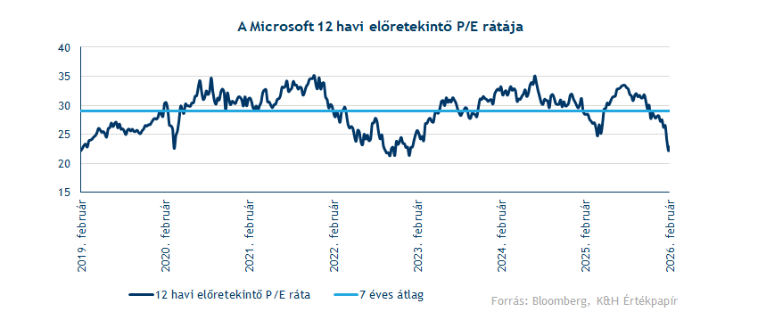 Érdemes kiemelni, hogy a Microsoft részvénye jelenleg olyan alacsony értékeltségi szinten forog, amire évek óta nem volt példa. A 12 havi előretekintő P/E ráta jelenlegi 22,8-as értéke jelentős diszkontot mutat az elmúlt 7 év historikus átlagához képest, amely 29-es szintet jelent. Hasonló árazottságot legutóbb mintegy 3 éve, 2023 elején láthattunk a Microsoft papírjánál. Jól látható tehát, hogy az elmúlt hetek korrekciója jelentősen csökkentette a vállalat értékeltségét, miközben a profitelőrejelzésekben nem történt jelentős változás.