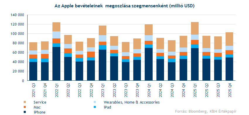 Az utóbbi években a legnagyobb növekedési ütemet a szolgáltatások terén tudta elérni az Apple, ez nem volt másképp a most zárult időszakban sem. A szolgáltatás szegmens bevétele 15 százalékkal 28,8 milliárd dollárra emelkedett. A Google jogi győzelme a Chrome leválasztása kapcsán az Apple számára is kifejezetten jó hír. Tehát a Google továbbra is évi 20 milliárd dollárt fizethet ki a cég számára, hogy a Safari böngészőben az alapkeresőmotor maradjon.