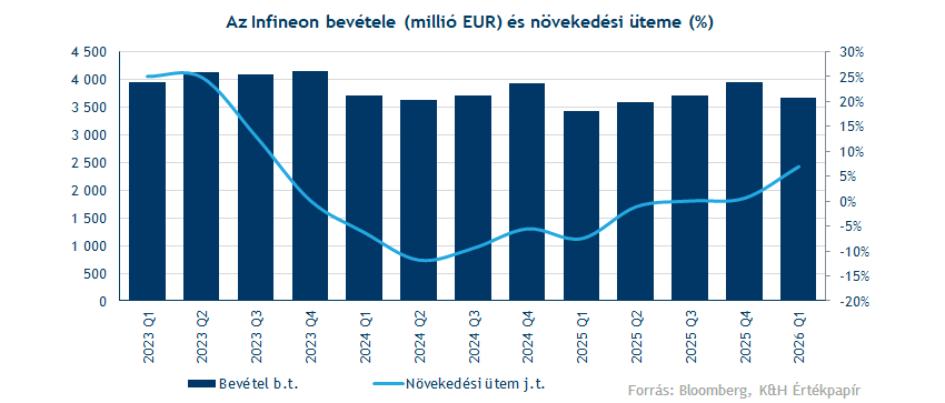 Az erős AI-keresletre reagálva az Infineon gyártókapacitásainak bővítése mellett döntött, így a cég 500 millió euróval 2,7 milliárd euróra emelte az éves beruházási keretét. Emellett a chipgyártó egy akvizíciót is bejelentett, az osztrák ams OSRAM szenzorüzletágának tervezett felvásárlását 570 millió euróért. Ezzel a tranzakcióval az Infineon tovább erősítené az autóipari, egészségügyi és robotikai portfólióját. Bár a növekvő beruházási kiadások és a felvásárlás rövidtávon terhelhetik az Infineon profitabilitását, azonban a Bloomberg számításai szerint a tranzakció már az idei naptári évben 230 millió euró többletbevételt generálhat.