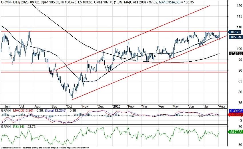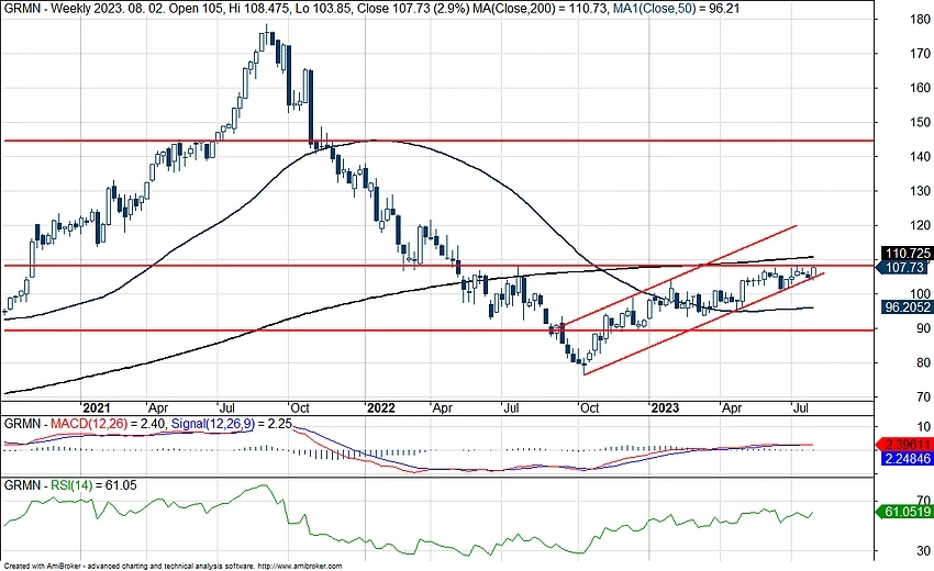 Emelkedő trendcsatornában folytatná a felfelé tartó mozgását a Garmin, emellett az 50 napos mozgóátlag is fontos segítséget jelenthet az árfolyam számára hosszabb távon is. A tegnap közzétett negyedéves jelentés következtében felülteljesítő tudott maradni a piacon a részvény, így a technikai kép sem romlott el, jelenleg fontos ellenállási szint áttörése előtt állhat a részvény.