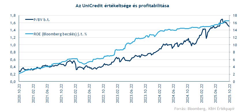 A bank értékeltsége is magasabb szintekre emelkedett az utóbbi években, de jól láthatóan ezzel együtt sajáttőke arányos megtérülés is hasonló ívet futott be. A régiós társakkal összehasonlítva sem látható már diszkont az UniCredit értékeltségében, a jelenlegi 1,5-ös P/BV ráta és a 16 százalék körüli ROE nagyjából megfelel az iparági átlagnak.