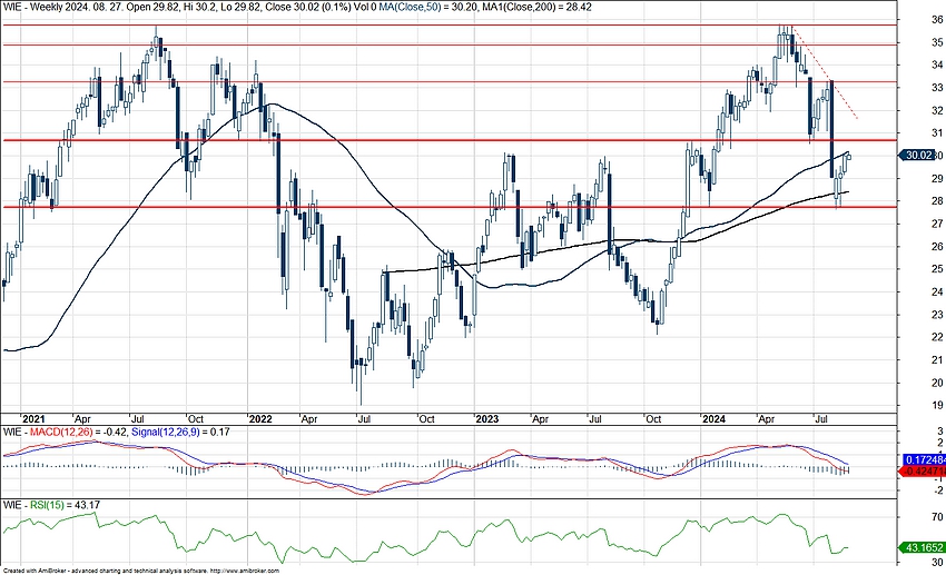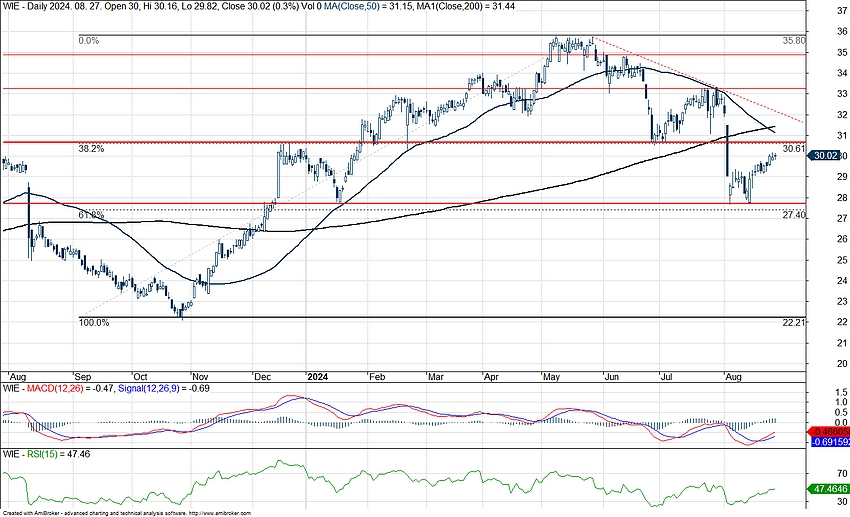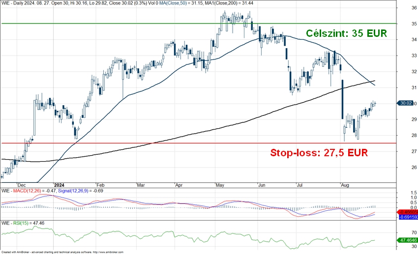 Az elmúlt időszakban visszaesett a Wienerberger árfolyama, azonban látható egy rövidtávú visszaemelkedés a részvénynél, és jelenleg a 30 eurós szintet próbálja áttörni az árfolyam. A korábbi esés megközelítette a 61,8-as Fibonacci szintet, jelenleg pedig a 38,2-es szint állhat az árfolyam útjában.