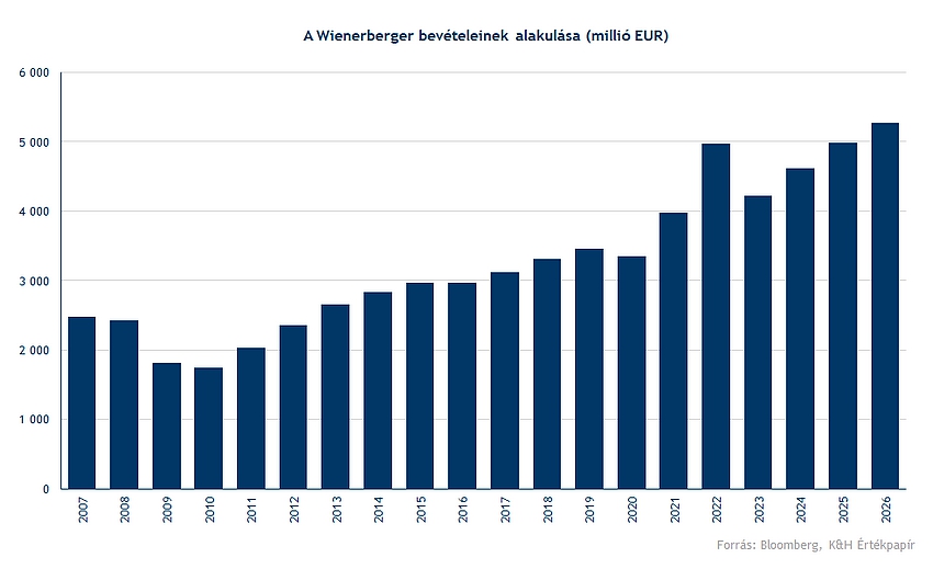 Az elmúlt évek azért kihívásokkal teli időszak volt a globális építőiparban, ennek ellenére azért stabil teljesítményt nyújtott a Wienerberger, amely az egyik legnagyobb építőanyag (tégla, cserép, különböző burkolatok) gyártója. A legfrissebb eredmények alapján a cég 2,2 milliárd eurós bevétel ért el az első félévben, az előrejelzések alapján pedig közel 5 milliárd euró lehet az éves bevétel. Látható, hogy a 2022-es év sikerült kiemelkedően, azóta a bevételi szint visszaesett, de hosszabb távon a stabil növekedés látható.