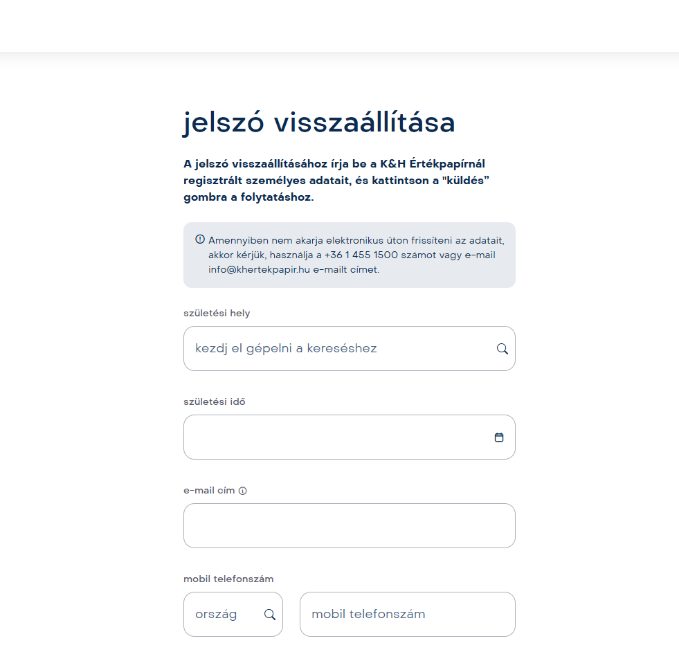 • A bankok és a pénzintézetek soha nem kérik, hogy SMS-ben, e-mailben, vagy bármilyen egyéb csatornán küldött üzenetben található linkre kattintva lépj be a K&H webtrader fiókodba.
